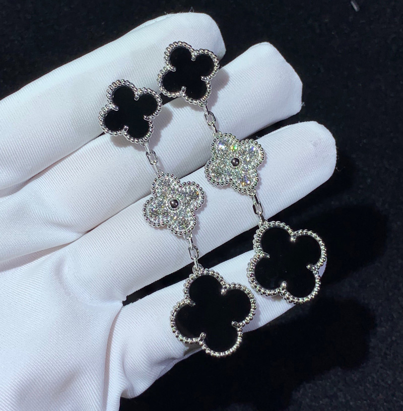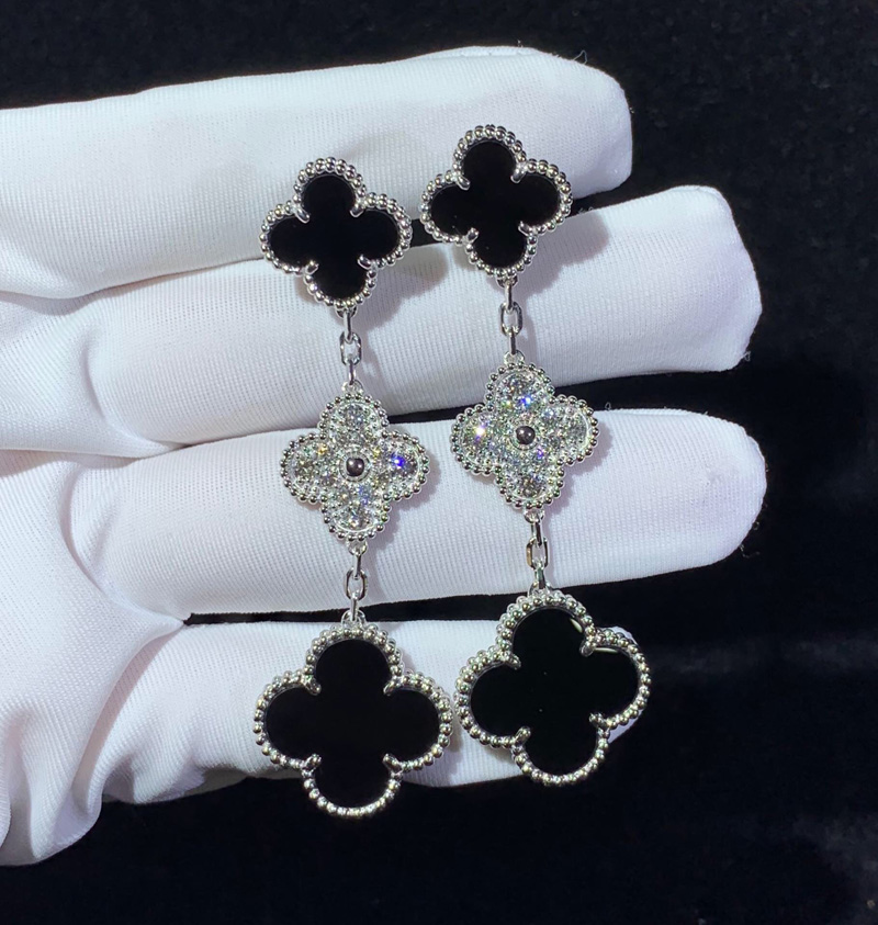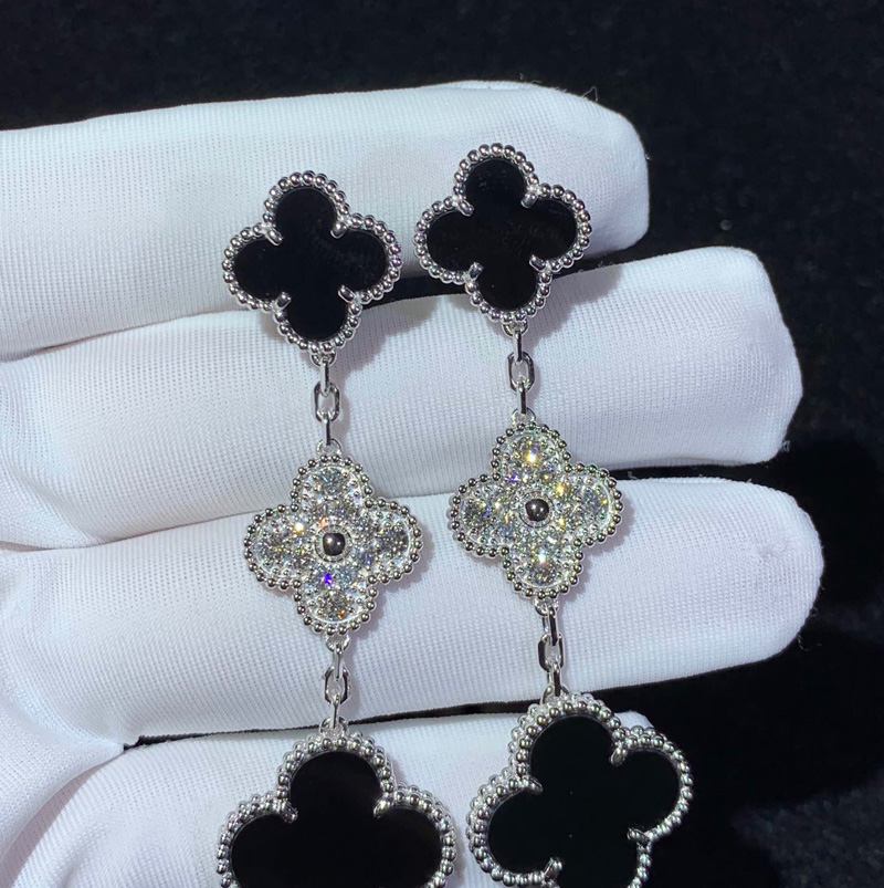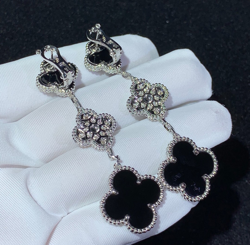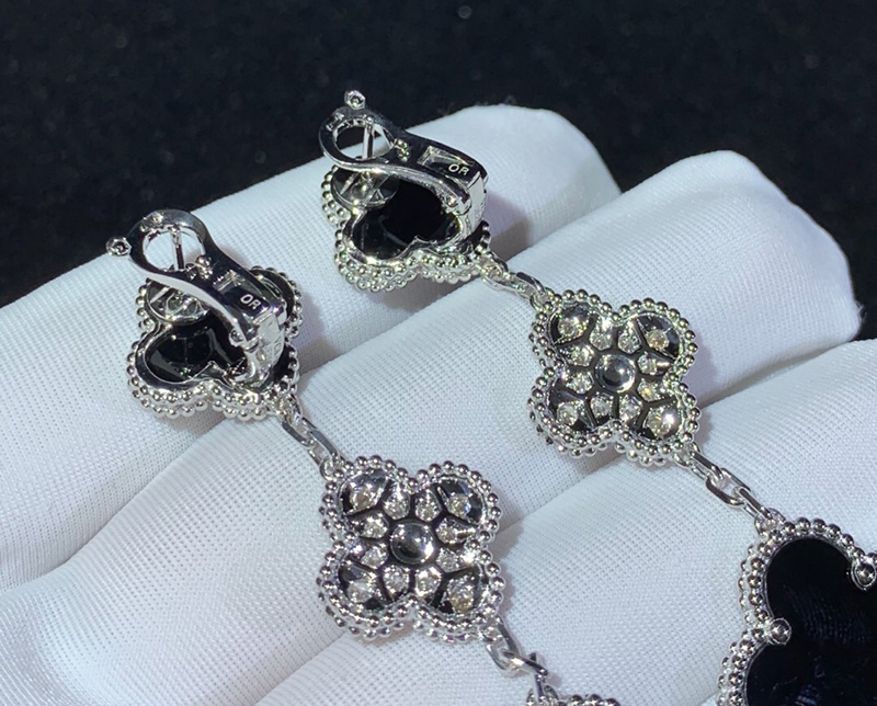 Van Cleef & Arpels Magic Alhambra Earrings Natural Diamond Agate 18K White Gold Custom